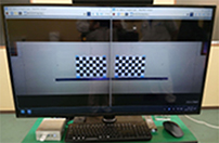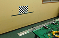 カメラ2基を長さ1.5mの角材に適切な間隔で固定(写真1)した後、移動式実験台の端に水平設置し、校正用格子パターンおよび金尺(1m)を貼り付けた壁面を撮影しました。カメラ間隔60または80cm、壁からの距離1または2mの複数条件で比較した結果、カメラ間隔80cmがROV搭載時の最適条件であることがわかりました(写真2・3)。現在、撮影画像の3Dオルソ画像化を検討中です。