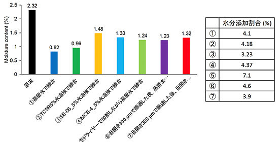 7種類の造粒条件(蒸留水のみ、TC-5R 5%水溶液、SE-06 5%水溶液、MCE-4 5%水溶液、ドライヤー乾燥、篩過、押し出し等)を検討した結果、結合液に水を使用することで造粒可能であることを確認しました(図1)。特に、結合剤としてTC-5R(HPMC)を用いた場合に流動性の良い顆粒が得られることが明らかとなりました。造粒後の顆粒中の水分率は約1%であり、60℃での加熱により十分な乾燥が可能であることを確認しました。また、顆粒サイズは約500~2000μmであり、造粒条件により制御が可能であることが示されました。